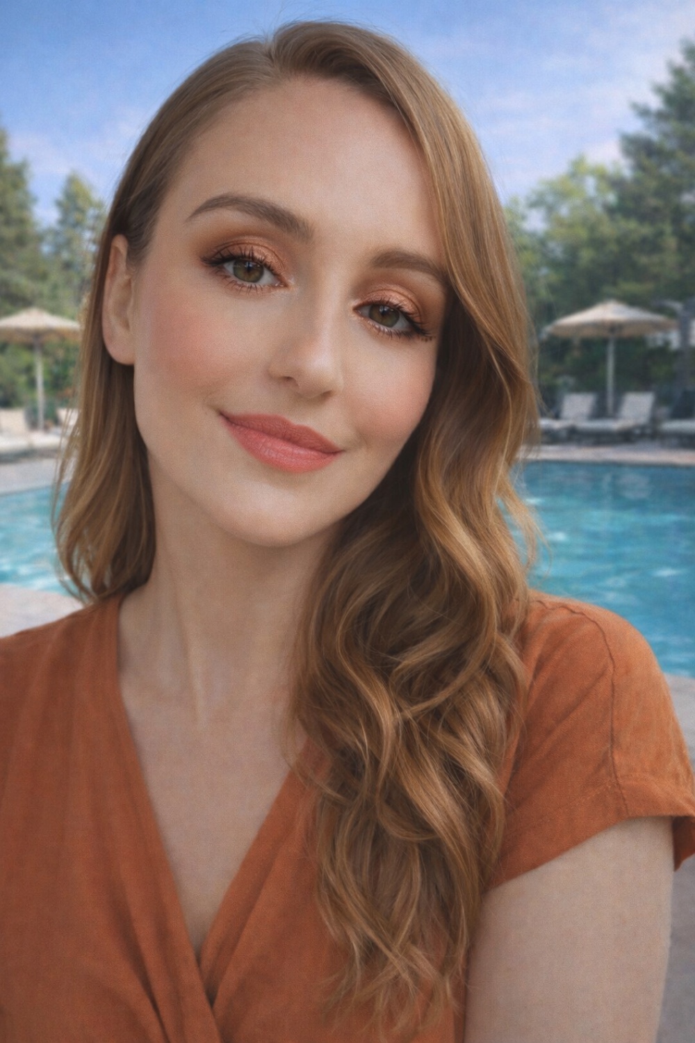 Set against a tranquil poolside backdrop, this beauty look reflects the essence of holiday simplicity — fresh skin, warm-toned makeup and softly styled hair that moves naturally. The overall aesthetic is polished yet relaxed, making it perfect inspiration for both everyday wear and special occasions.