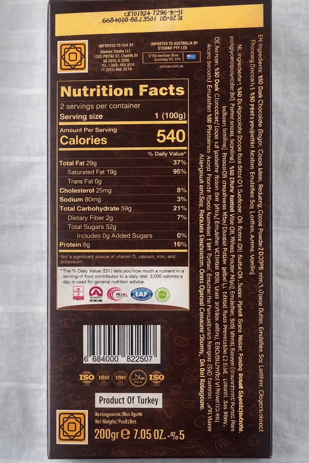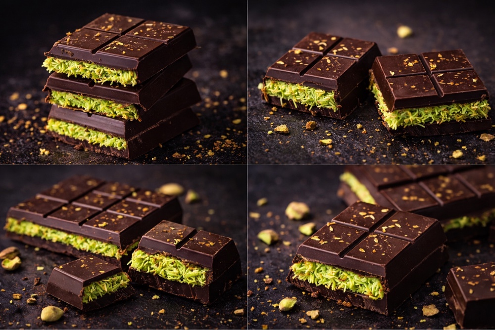 Key ingredients include dark chocolate, pistachio cream, and kataifi pastry. The flavour profile is rich and nutty with a smooth texture and light crunch.